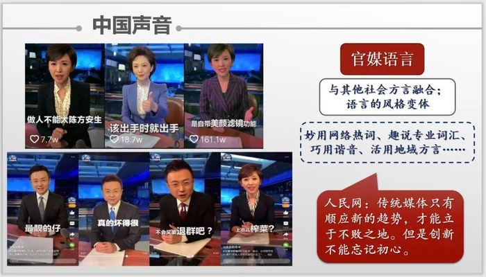 她结合语言热点,以《主播说联播》短视频节目为切入点,让学生从思考这些主播们的话语显示出了怎样的语言特点,为何网友们称之为“接地气”?让学生感受到,新媒体时代下主流媒体在话语方式上,利用各种社会方言所进行的积极尝试和创新。