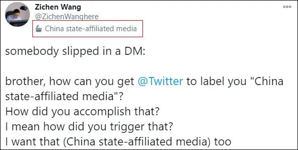 今天(23日)上午,新华社记者王子辰在推特发布的一段私信对话截图显示,有位大兄弟“看上”了他账号名字下的“China state-affiliated media”(中国官方媒体)标签,并表示很想要一个。