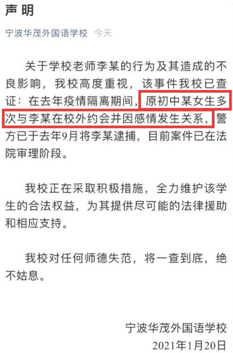 声明称,在去年疫情隔离期间,原初中某女生多次与李某在校外约会,并因感情发生关系。