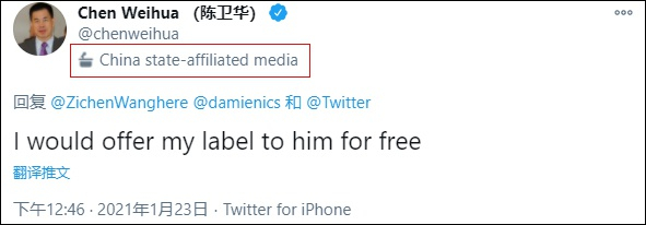 看到有网友如此“眼馋”这标签,获得推特“特殊待遇”的《中国日报》欧盟分社社长陈卫华主动表示,“我愿意把我的标签免费让给他。”