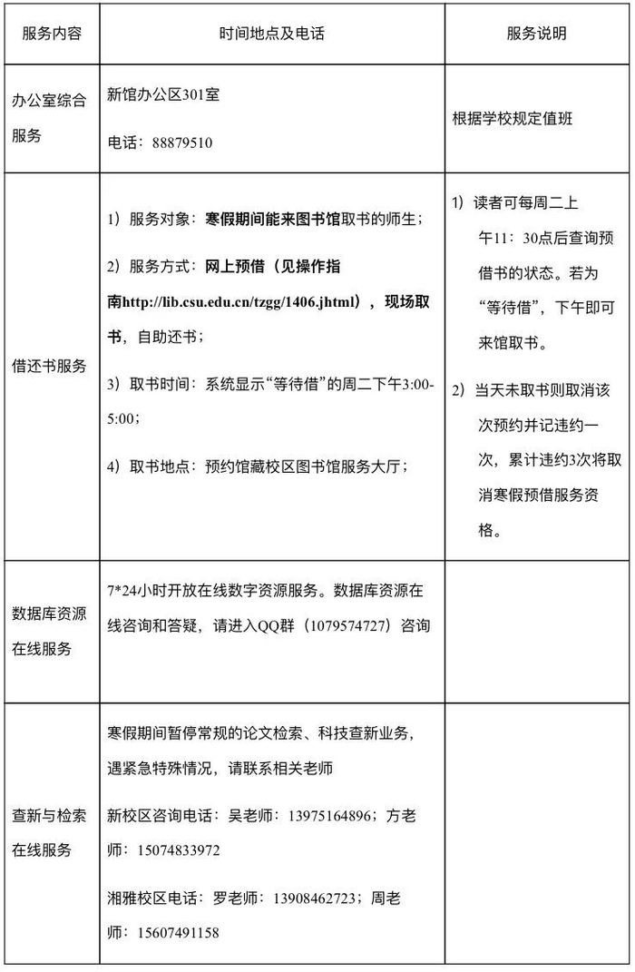寒假期间,图书馆读者服务工作具体安排如下: