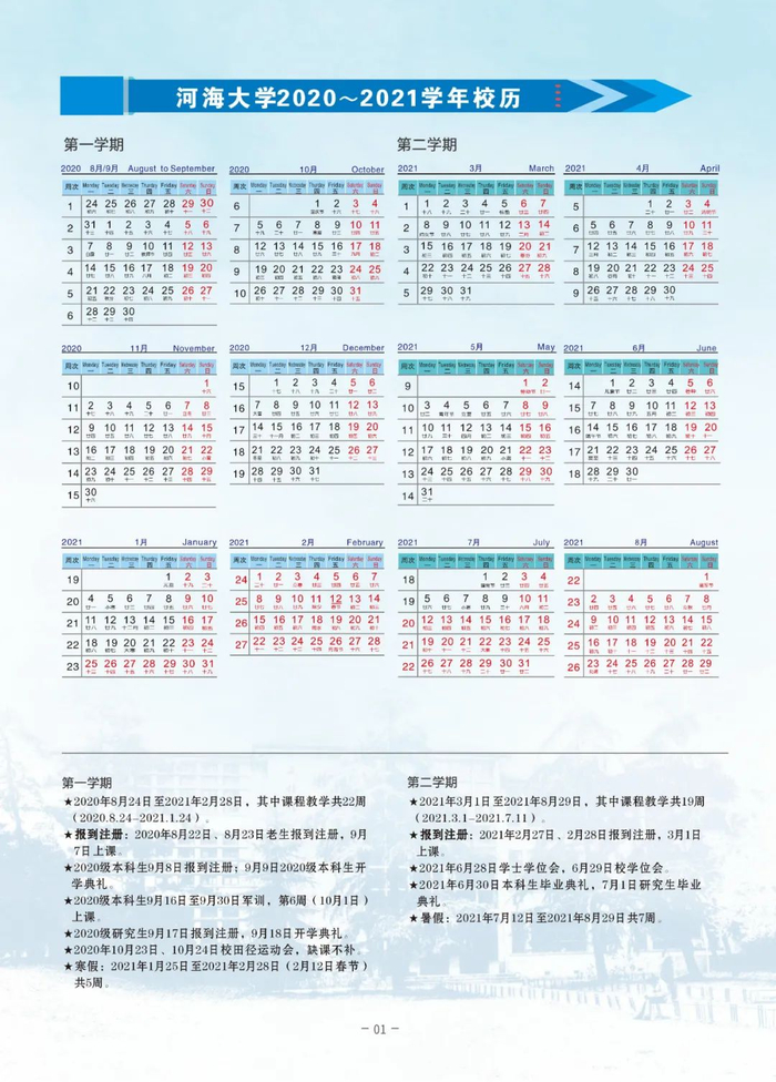 期末周结束,河海人的寒假来啦!根据校历安排,2021年寒假自1月25日至2月28日,共5周。2月27日、28日到校报到册,3月1日正式上课。