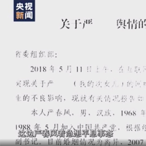 “严书记是不是我们那个严书记?其实当时我就有一点怀疑,因为我大概知道他家里面的情况,”时任四川省广安市委办工作人员王平在专题片中称。他很快就确定了,网上说的严书记正是自己的上司——时任四川省广安市委副书记的严春风。因为他随后就接到了严春风的电话,布置他立即起草一份情况说明向组织解释,核心内容是要表明自己已经离婚,是前妻擅自打着自己的名号惹是生非,与他本人无关。