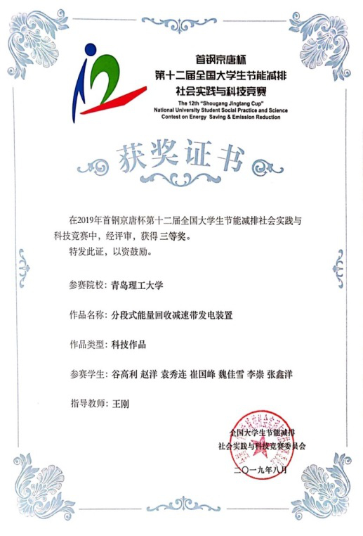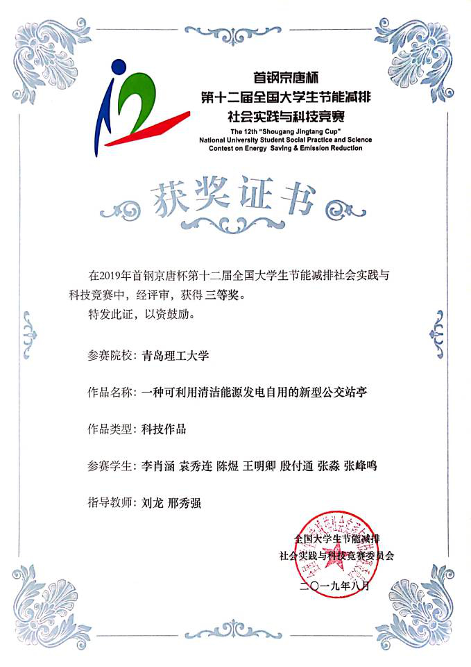 2019.08 第十二届全国大学生节能减排社会实践与科技竞赛三等奖两项