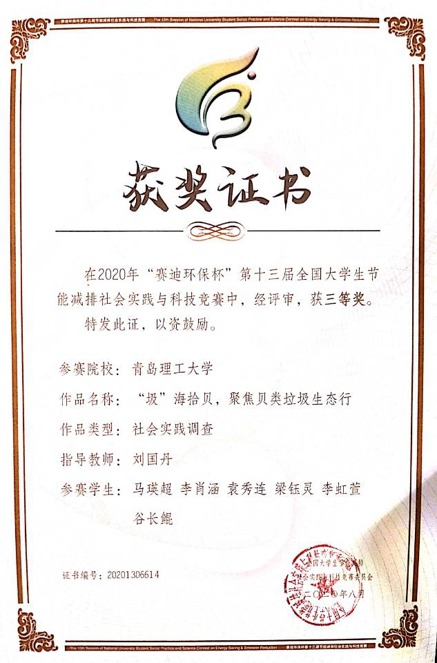 2020.08 第十三届全国大学生节能减排社会实践与科技竞赛三等奖