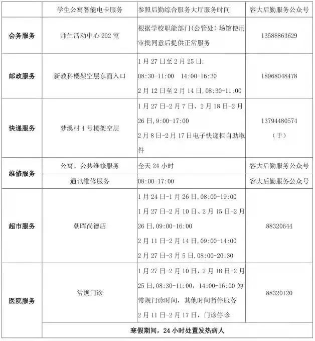 为做好寒假期间留校学生的生活服务和关怀慰问,确保留校学生在校期间过一个温馨、舒适、祥和的新年,容大集团假期提供暖心服务十条,具体情况如下:
