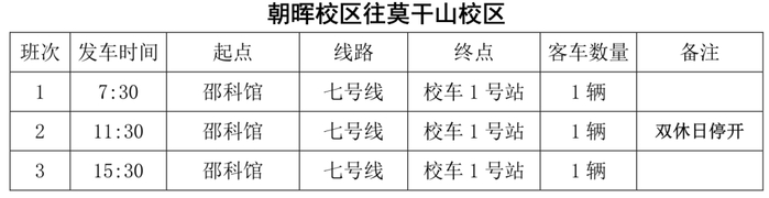 莫干山-朝晖:莫干山校区(校车 1 号站-校车 2 号站-校车 3 号站-校车 4 号站-校车 5号站-东门)、大关北公交站、德胜新村公交站、朝晖校区(南门-邵科馆)