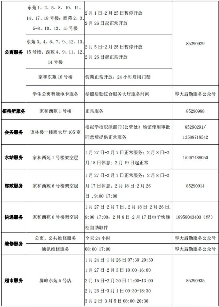 产业系统各单位、容大后勤集团和经营承包单位的寒假(轮休)时间在保障学校相关工作正常进行的前提下自行安排。