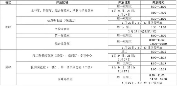 根据学校《关于调整2020-2021学年寒假放假时间的通知》精神,图书馆1月24日进入寒假开放时间,2月11日(除夕)—2月17日(初六)为春节假期,图书馆停止开放。2月28日起正常开放。其余开放时间和开放区域安排如下: