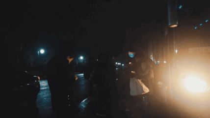 路灯照亮下,风雨穿行中
