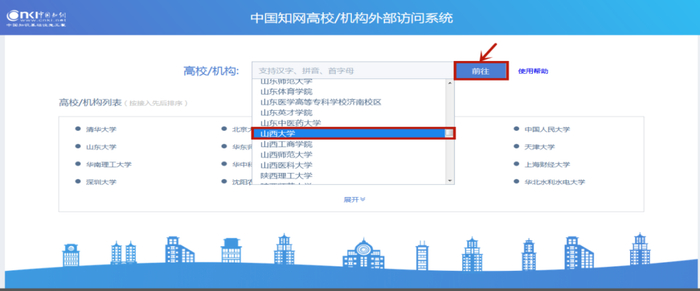 输入网址:http://fsso.cnki.net,在页面上的“选择高校/机构”下拉框中选择“山西大学”,点击“前往”。