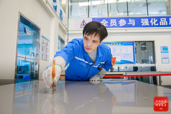 湖北省宜昌市玻璃切装工程师唐向成主持对超薄电子玻璃在线切割工艺参数摸索及固化,完成了工艺参数的定型,继实现0.2毫米超薄玻璃成功量产,打破欧美和日本的技术垄断后,又实现了0.18毫米厚度的超薄电子玻璃的持续稳定生产。(湖北省宜昌市纪委监委供 谭雪姣 摄)