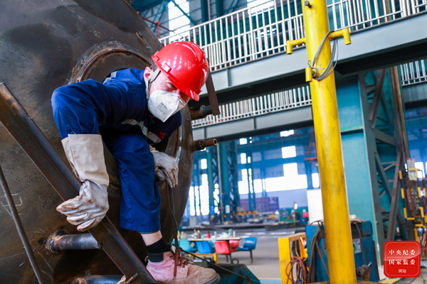 江苏省张家港市电焊工泮延镇从18岁成为一名学徒工以来,扎根一线,苦求技艺,成长为电焊技术骨干,因技术过硬和水平高超于2020年11月被评为全国劳动模范。图为泮延镇完成150摄氏度高温作业后从锅筒内钻出来。(江苏省张家港市纪委监委供 庞瑞和 摄)