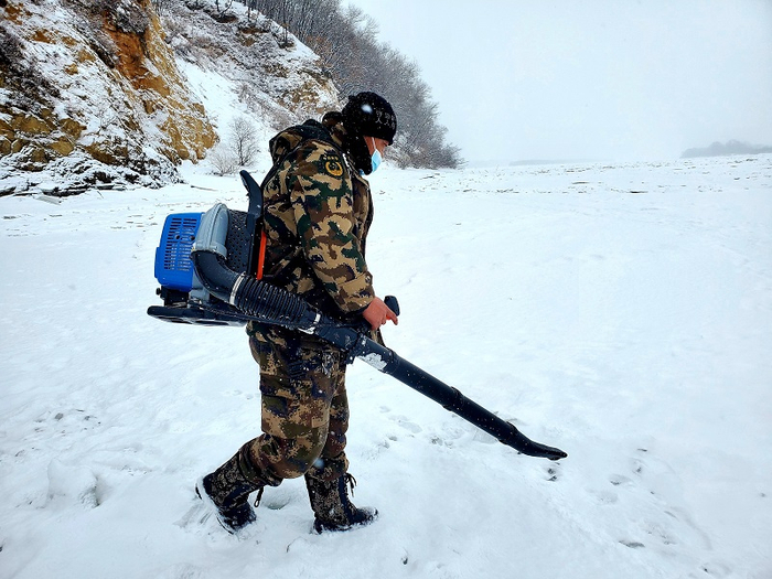 由于追寻东北虎足迹这天下起了大雪,湿地管理局的工作人员,用灭火鼓风机吹散覆盖在冰面上的浮雪后,一串串清淅的老虎脚印出现在江面上。