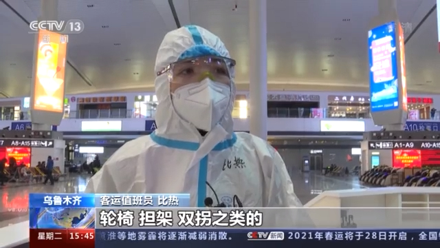 客运值班员 比热:比如说需要辅助器械的轮椅、担架、双拐之类的,就送到那个进站口,就是从外面进站口接到旅客,然后到我们重点旅客服务区,等车到了再把旅客送到车上,全部一路上都提供绿色通道。