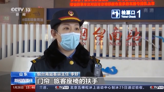烟台南站客运主任 李好:我们会对旅客重点使用的比方说像门帘、旅客座椅的扶手还有经常使用到的检票闸机,包括自动售票机进行不少于四次的重点擦拭消杀。