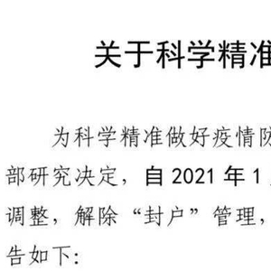 1月26日,记者从黑龙江绥化市兰西县疫情防控应急指挥部了解到,为科学精准做好疫情防控工作,经兰西县疫情防控应急指挥部研究决定,自 2021年1月27日0时起,对现行防控措施进行调整,解除“封户”管理,但仍实行严格管控。现就相关事宜公告如下: