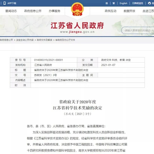 江苏省人民政府设立的科学技术奖,旨在奖励本省科学技术活动中做出重要贡献的单位和个人,每年评审一次,每次奖励总数不超过300项,其中,一等奖项目不超过45项,二等奖项目不超过90项。本届共评选出江苏省科学技术突出贡献奖2项,江苏省科学技术一等奖45项,二等奖74项,三等奖152项,以及江苏省国际科学技术合作奖7项。