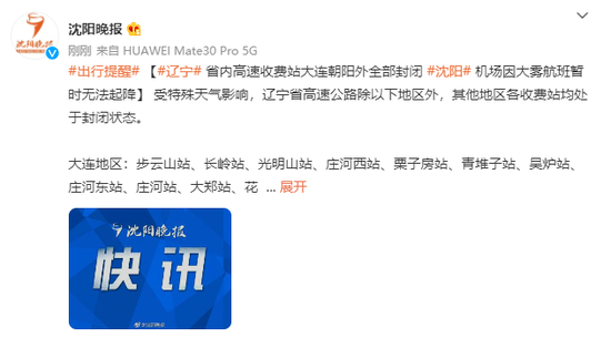辽宁省内高速收费站除大连朝阳外全部封闭 沈阳机场因大雾航班暂时无法起降