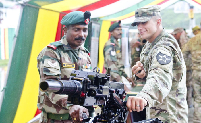 美印联合演习中美军士兵教印军士兵使用武器