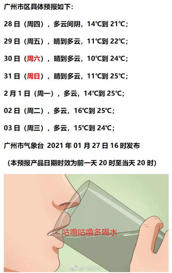 广州市气象台预计,新一股冷空气28日早晨开始自北向南影响广州,广州以多云天气为主,气温下降3~5℃,港口阵风增加至6~7级;30日至2月1日,广州晴到多云。