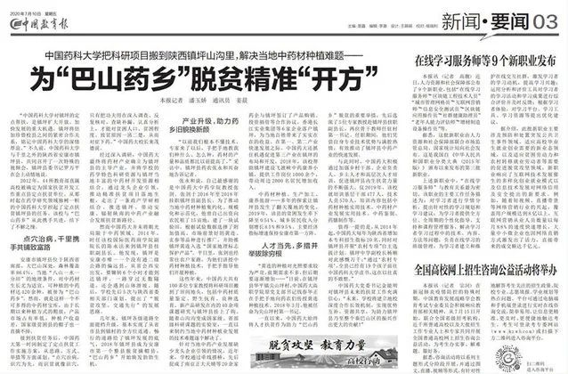 1月8日和7月10日,《光明日报》和《中国教育报》分别以《中国药科大学:精准“把脉” 为“巴山药乡”开出扶贫良方》和《中国药科大学把科研项目搬到陕西镇坪山沟里,解决当地中药材种植难题——为“巴山药乡”脱贫精准“开方”》为题,在版面头条位置刊发长篇通讯,深入聚焦报道了多年来我校多措并举精准施策打好教育扶贫“组合拳”,助力镇坪县实现高质量脱贫、铺就致富康庄大道的典型经验,在社会上引起强烈反响。作为中共中央宣传部推荐的“高校助力脱贫攻坚”典型高校之一,我校精准扶贫助力镇坪脱贫攻坚典型经验受到《光明日报》和《中国教育报》专题报道,不仅彰显了我校在高校脱贫攻坚工作中的典型形象,更为重要的是,在全国范围内将我校的社会影响力、知名度和美誉度又推向了新的高峰。