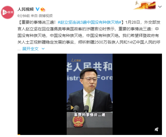 1月28日,外交部发言人赵立坚在回应蓬佩奥等美国政客的涉疆言论时表示,重要的事情说三遍:中国没有种族灭绝,中国没有种族灭绝,中国没有种族灭绝。我们希望拜登政府有关人士正视新疆稳定发展的事实,倾听新疆2500万各族人民和14亿中国人民的呼声,本着基于事实和负责任的态度,稳慎处理相关问题。我们坚决反对任何外部势力借涉疆问题干涉中国内政,必将继续坚定维护中国主权安全发展利益。
