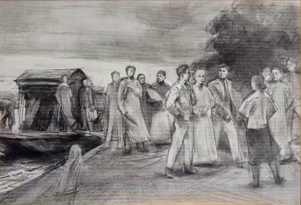在场景的选择上,究竟是选择上船的场景,还是开完会下船的场景,是两位作者曾纠结的问题。“当时有专家认为,登船时会议还没开完,和‘启航’这一主题不太匹配。”画作作者何红舟介绍,为了更好体现“启航”这一主题的启示、中共一大代表的决心信念,他们最终还是选择了上船的场景。
