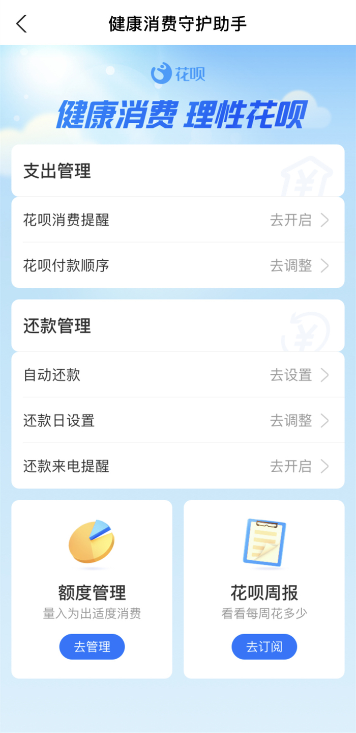 即日起,用户可通过花呗下方的消费助手进入健康消费守护助手页面,更为便利地调整付款顺序,设置花呗额度、还款日,还可以查看花呗周报。