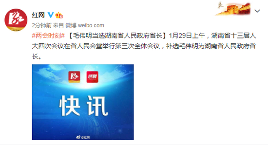 1月29日上午,湖南省十三届人大四次会议在省人民会堂举行第三次全体会议,补选毛伟明为湖南省人民政府省长。