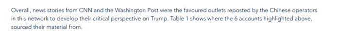 另外,该报告还将一些转发了美国主流媒体批判特朗普当局政策的报道的中文或英文账号,或是给中国外交部或中国一些知名媒体人发表的批判特朗普当局言行的贴文点赞的账号,也都说成了是来自中国的网络水军机器人,并宣称这些账号在影响美国的大选舆论。