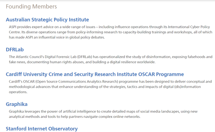 该成员列表中还包括美国智库“大西洋理事会”的一个数字实验室、斯坦福大学的一个互联网观测项目组,以及美国一家人工智能分析公司。