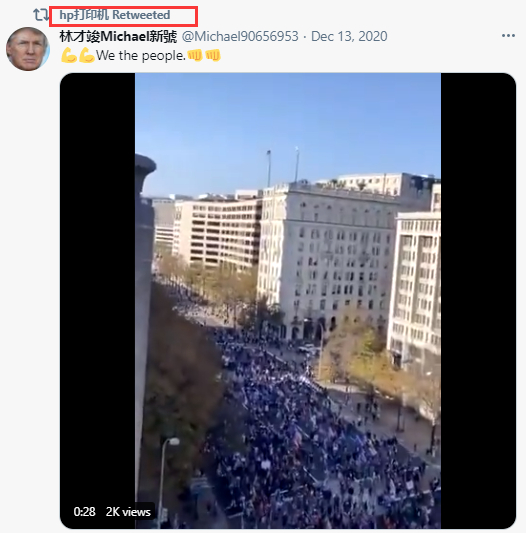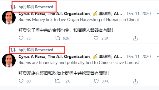 比如下图中这个在报告中被说成是“中国水军机器人”的账号“hp打印机”,实际上就一直在转发大量法X功势力编造出的帮特朗普污蔑拜登“通中通共”的谣言。而且这些谣言的内容本身都带有极为明显的法X功特点。