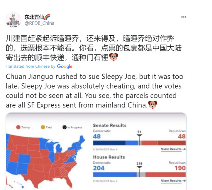 同样的,在去年11月美国总统大选后,拒绝承认败选的特朗普一方为推翻选举结果曾编造了诸如“支持特朗普的选票被烧毁”这样的谣言,这些谣言也同样被法X功及其网站媒体所进一步扩散和转发。可在卡迪夫大学犯罪与安全研究所这份报告的第二部分中,这些账号却也被说成了是“与中国有关联的网络水军机器人”。