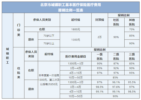目前,北京市在职职工医院门诊报销比例达到70%以上,退休人员达到85%以上,社区卫生机构报销比例均为90%,门诊封顶线为2万元。