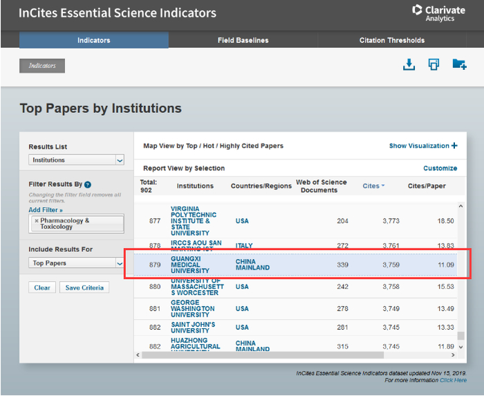 2019年11月,“药理学与毒理学”首次进入ESI学科全球排名前1%