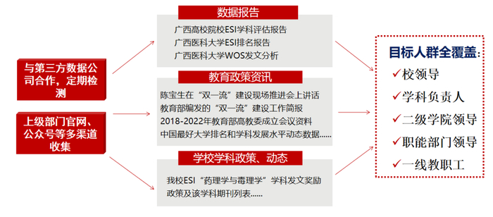 定期发布学科数据监测分析报告,上级部门官网、公众号等多渠道收集教育政策咨询、学科发展动态等,并不定期向职能部门和一线教师推送。编制《广西医科大学一流学科建设工作简报》,及时总结成功经验、固化创新成果,同时将我校学科建设工作进展情况与各级相关部门进行交流传递。