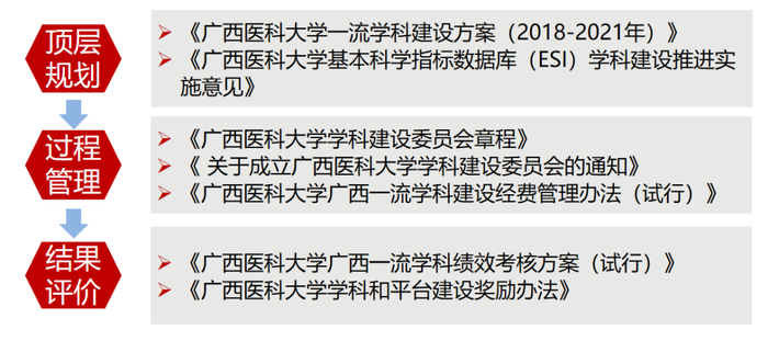 先后组织有关职能部门、二级学院、校内外专家100多人次制定一流学科建设方案,开展专家论证工作,科学编制6个广西一流学科建设任务书。在顶层规划方层面,制定了学校的一流学科建设方案和6个广西一流学科建设方案,明确我校一流学科发展目标和关键性突破指标,建设内容,以及责任分工等。适时召开工作推进会,立行立改,推进问题解决。就人才培养、人才引育、国际合作与交流等开展专题研讨会,切实推进一流学科建设。在过程管理层面,组织成立广西医科大学学科建设委员会和临床医学等11个一级学科建设委员会,并制定委员会章程,强化学科建设中的学术权力。为确保一流学科经费使用规范性和科学性,制定经费管理办法,明确经费管理职责,规范经费使用、审批要求。在结果评价层面,发挥绩效在统筹推进一流学科建设中的导向作用,落实建设成效与经费特如挂钩的绩效改革目标,助推重点突破指标的完成,制定绩效考核方案和学科建设奖励办法。