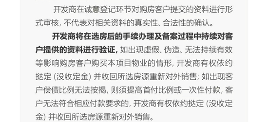 值得注意的是,在销售公示的项目提示部分,明确了如出现虚假、伪造、无法持续有效等影响购房客户购买本项目物业的情形,或发现客户存在众筹、代持等购房行为,将依法追偿和没收全部购房定金,并将相关失信行为推送市公共信用平台。