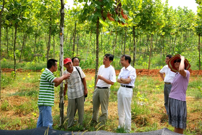 ▲包满珠(右四)在基地查看新品种悬铃木生长情况
