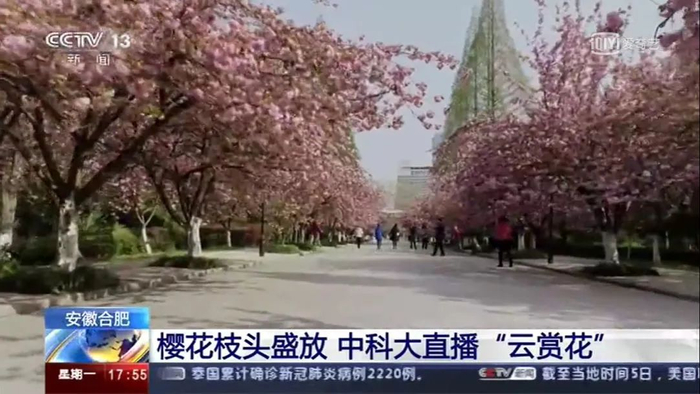 安徽合肥中国科大校园内,一簇簇樱花枝头绽放。今年受疫情影响,学校首次开通网络直播平台,人们可以通过看直播云赏花,感受樱花盛开的浪漫时刻。