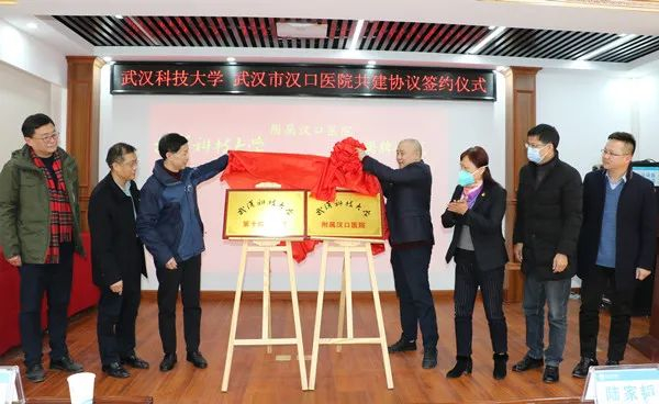 吴怀宇和陆家韬签署校院共建协议。双方领导为“武汉科技大学附属汉口医院”及“武汉科技大学第十临床学院”揭牌。