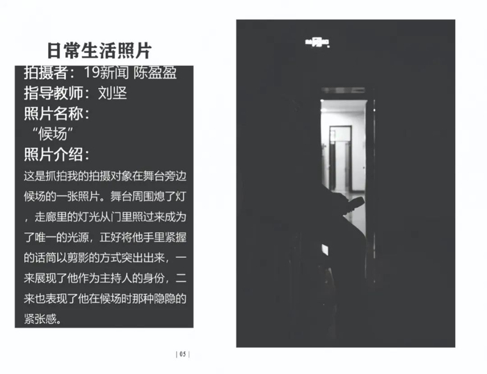 点评:整体拍摄得不错,日常照片中话筒的元素过多。在候场的照片拍出剪影的效果,可以让拍摄对象弓着身子靠近话筒,剪影效果会好一些,相似状态镜头很多。