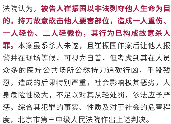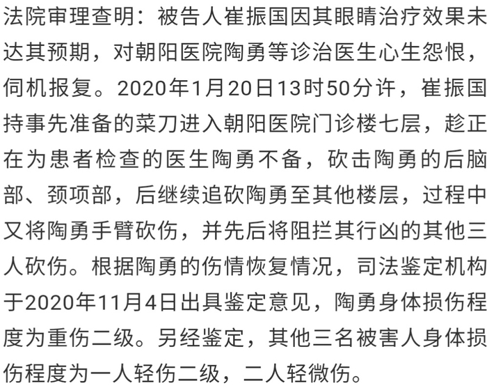 2021年2月2日上午,北京市第三中级人民法院公开宣判了北京朝阳医院伤医案,以故意杀人罪判处被告人崔振国死刑,缓期二年执行,剥夺政治权利终身。