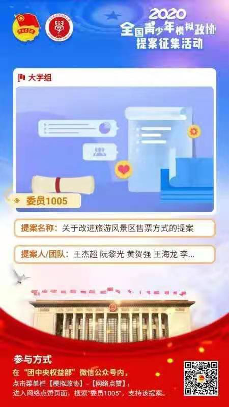 而王杰超团队《关于改进旅游风景区售票方式的提案》同样受到了广泛关注。王杰超表示,自己比较喜欢旅游,但在旅游过程中常常会遇到售票方面的问题。他和团队通过分析研究省内旅游景点在旅游旺季线上平台售票的情况,发现不同旅游风景区售票方式、门票提前预约时间不统一的现象比较突出,游客尤其是散客买票难、买不到票的问题仍然存在,从而降低了游客的旅游体验。因此,他和团队建议建设区域性的线上购票平台,联程的热点旅游城市之间加强对线上购票平台和可预约时间的协调,同时扩充线上购票平台种类,做到线上主流购票平台基本覆盖,协调统一区域内景区门票的提前预约时间,线上预约和线下售票合理覆盖等。经过团队的充分准备,他们的提案获得了比赛三等奖。