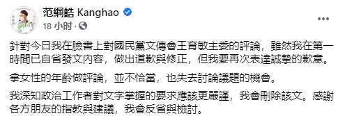 1日深夜,范纲皓针对此事在脸书发文道歉,称拿女性的年龄做评论,并不恰当,也失去讨论议题的机会。他说,虽然第一时间已自省发文内容,做出道歉与修正,但要再次表达诚挚的歉意。