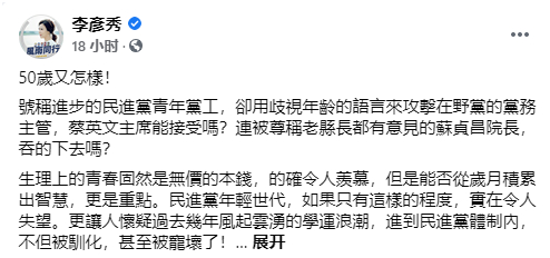 针对此事,国民党副秘书长李彦秀在脸书回击“50岁又怎样!”她表示,号称进步的民进党青年党工,却用歧视年龄的语言来攻击在野党的党务主管,蔡英文主席能接受吗?连被尊称老县长都有意见的“行政院长“苏贞昌院长吞得下去吗?李彦秀强调,生理上的青春固然是无价的本钱,的确令人羡慕,但是能否从岁月积累出智慧,更是重点。
