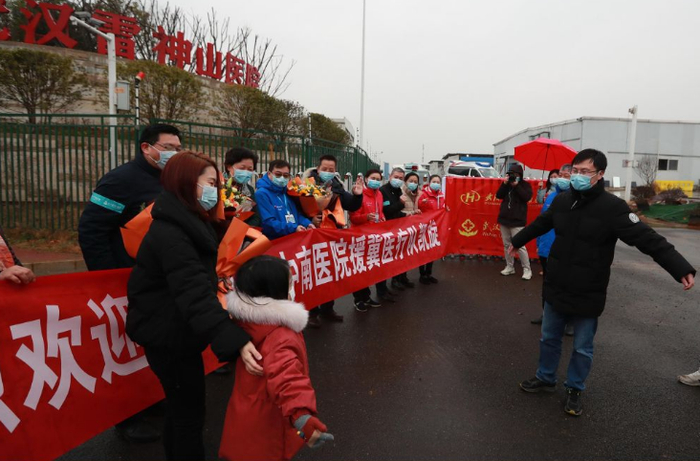 武汉大学中南医院援冀医疗队队员和女儿在雷神山医院门口“隔空拥抱”。