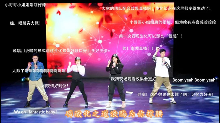 除了在内容上认真推敲,不少参赛作品在作品形式与表演上也下足了功夫。除了改编自流行音乐的中文歌,还有《Heredity's Secrets》、《Counting DNA》等英文歌曲,在表演中融入中国古典元素的《OA漂流记》、《焦磷酸七世》,将生化知识与北京小曲结合的《探生化河》,同学们自己谱曲创作的《生化永不挂》和《生物化学歌》,以及惊艳四座的纯人声演奏《Lipidspella》。同学们运用个人才艺与技术,将一首首作品打磨得更具魅力。