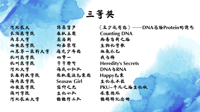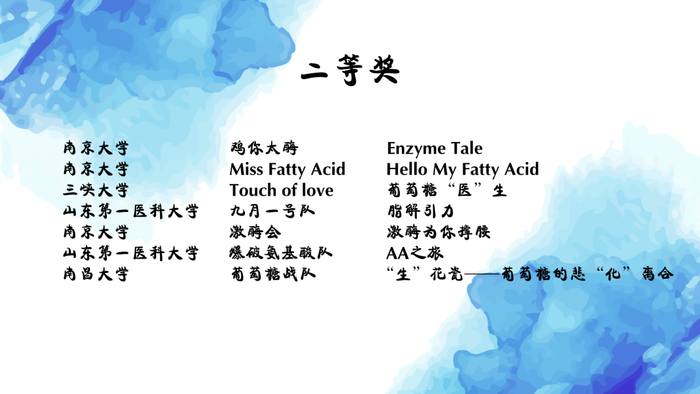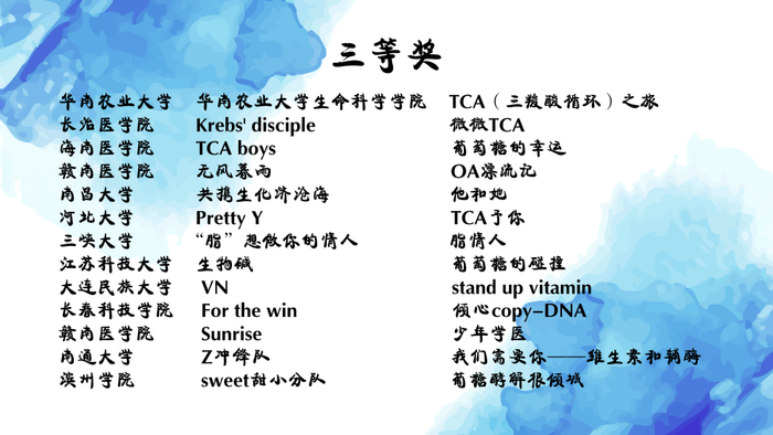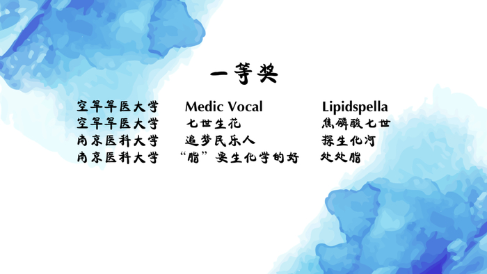 经过专家评委推荐,空军军医大学-Medic Vocal的《Lipidspella》,空军军医大学-七世生花的《焦磷酸七世》,南京医科大学-追梦民乐人的《探生化河》和南京医科大学-“脂”要生化学的好的《处处脂》荣获本届生化歌曲大赛的一等奖。南京大学-鸡你太酶的《Enzyme Tale》等七个作品荣获二等奖;河北农大-绿菜雪笋的《至少还有你——DNA写给Protein的情书》等二十六个作品荣获三等奖。此外,经过现场投票,山东第一医科大学-屠龙少年团的《血氨爪巴》获最佳创作奖,山东第一医科大学-爆破氨基酸队的《AA之旅》获最佳风采奖,山东第一医科大学-九月一号队的《脂解引力》获最佳人气奖。